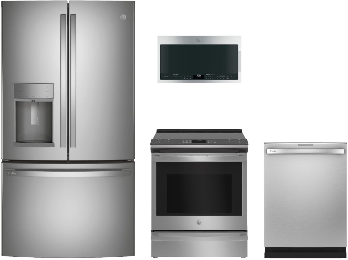 GE Profile™ 4 Piece Stainless Steel Kitchen Package with a french door refrigerator, slide in electric range, built in dishwasher and over the range microwaveRead More