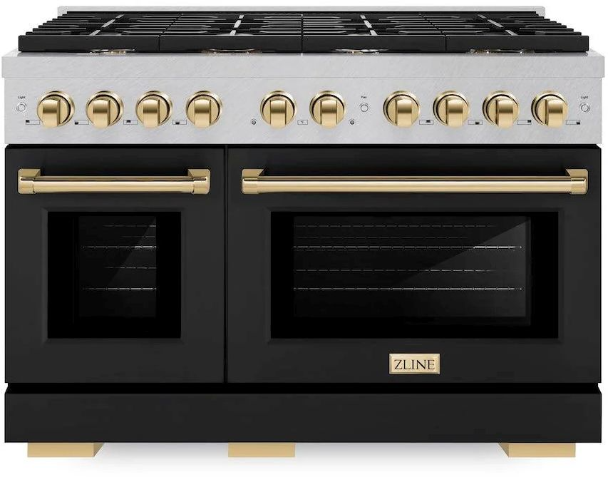 The ZLINE Autograph Edition 48 in. 6.7 cu. ft. Paramount Double Oven Gas Range with 8 Burner Cooktop in Satin Stainless Steel with Black Matte Doors and Polished Gold Accents (SGRSZ-BLM-48-G) features a versatile gas cooktop with 8 Italian-made auto-reignition burners, a large high-performing gas convection oven, a small baking oven, enhanced cast iron grates, beautiful black matte doors with Horizon window designs, and elegant polished gold knobs and handles allowing you to master every meal.
