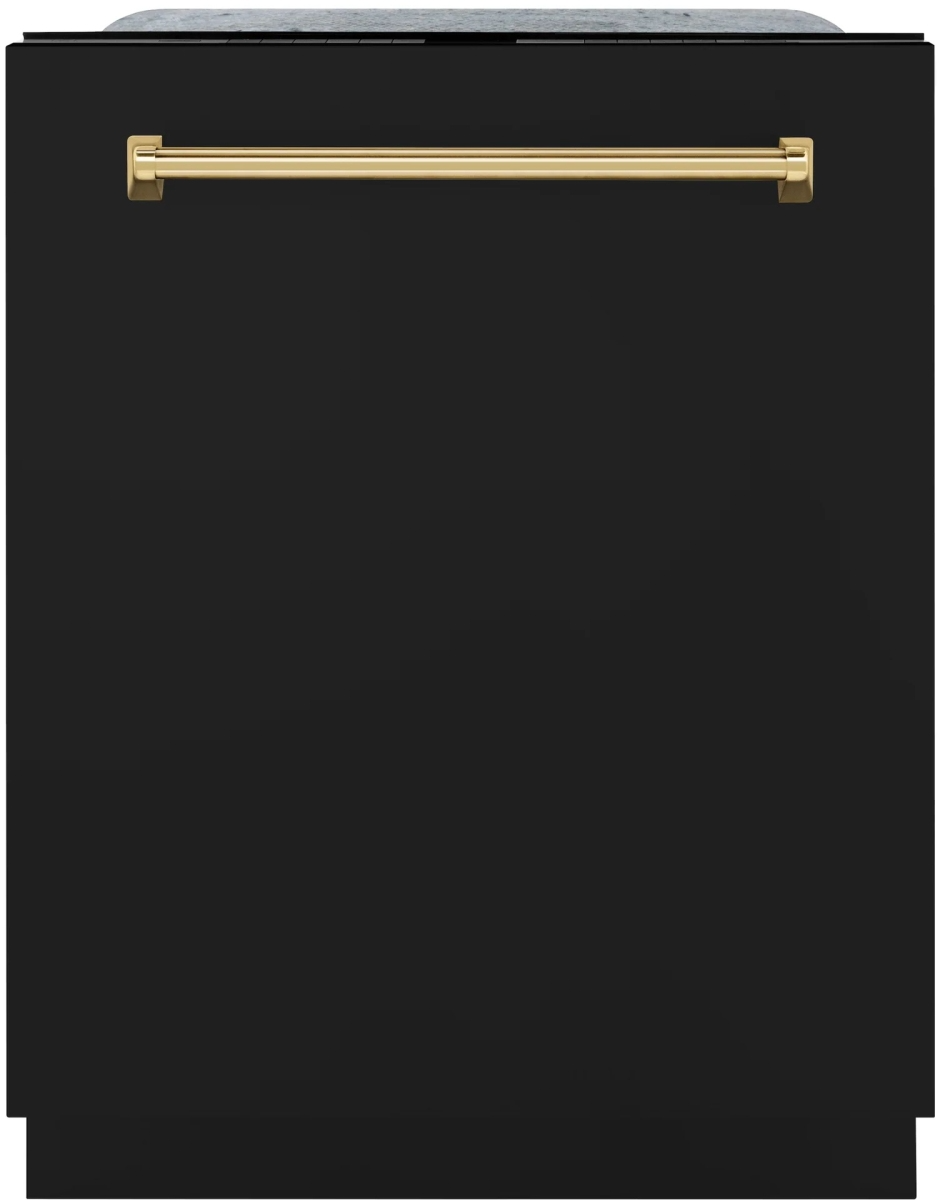 The ZLINE Autograph Edition 24" Monument Series 3rd Rack Top Touch Control Tall Tub Dishwasher in Black Matte with Polished Gold Handle, 45dBa (DWMTZ-BLM-24-G) utilizes innovative DuraWash® technology and powerful energy-efficient performance to achieve optimal results. Encompassing limitless beauty, precision, and quality, the Autograph Edition Series creates a luxury look that will transform your space.
