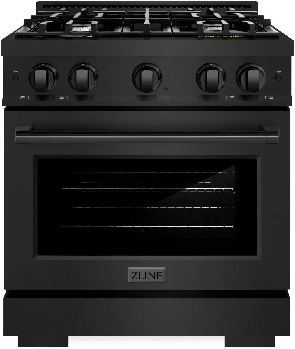 The ZLINE 30 in. 4.2 cu. ft. Select Dual Fuel Range with 4 Burner Gas Cooktop and Electric Convection Oven in Black Stainless Steel (HDRB-30) combines the elegance of a hand-finished porcelain gas cooktop with 4 Italian-made auto-reignition burners, an electric convection oven with an energy-efficient cooling fan to ensure quiet operation, and a Horizon oven door window design allowing you to master every meal.