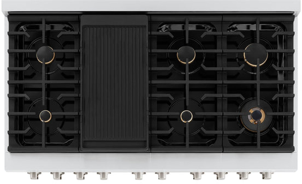 Outfit your ZLINE 48 in. SGR Series range with 6 high-quality brass burners to complement the 2 existing brass Dual Function Burners on the cooktop