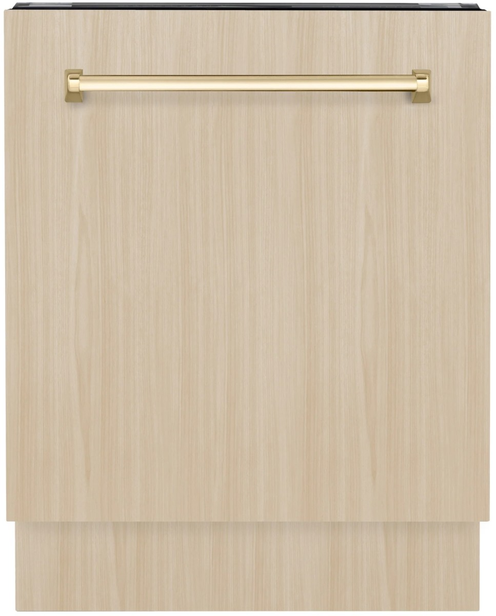 The ZLINE Autograph Edition 24"" Tallac Series 3rd Rack Top Control Built-In Tall Tub Dishwasher in Custom Panel Ready with Polished Gold Handle, 51dBa (DWVZ-24-G) features 8 unique wash cycles and a multiple filter system to deliver sparkling clean and dry dishes. Encompassing limitless beauty, precision, and quality, the Autograph Edition Series creates a luxury look by pairing an elegant polished gold handle with your own custom door panel.